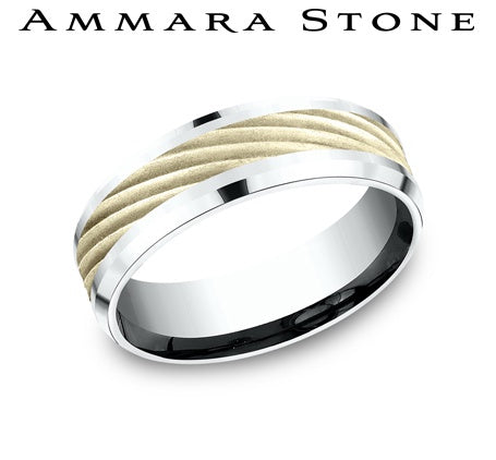 Benchmark Yellow and White Gold Bevel Edge Yellow Raised Swirl Center Wedding Band