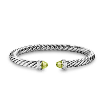 This David Yurman Cable Flex Bracelet showcases timeless elegance with a modern twist. Crafted in sterling silver with diamond accents totaling 0.131 carats, the signature 6 mm cable design is both sleek and flexible for a comfortable fit. Each end is adorned with a richly colored peridot gemstone, adding a vibrant pop of bright green hue. This bracelet is the perfect blend of sophistication and everyday wearability.