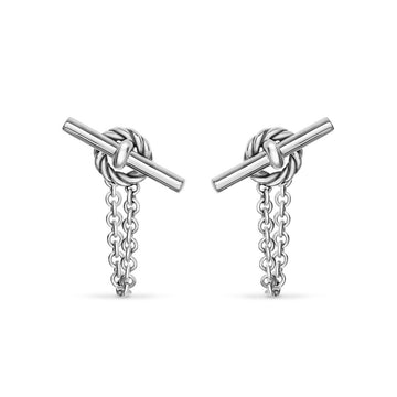 The David Yurman Sterling Silver 15 mm Petite Toggle Stud Earrings offer a modern twist on classic elegance. Featuring a signature toggle design intertwined with a delicate knot, these earrings exude both sophistication and versatility. The addition of dangling chain details creates a dynamic, eye-catching movement that enhances their unique appeal. Perfect for day-to-night wear, these studs add a chic and contemporary touch to any jewelry collection.