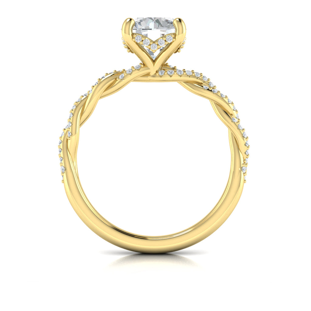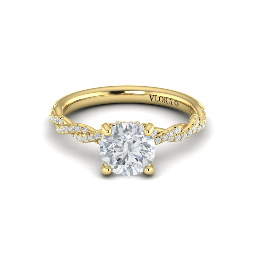 Celebrate your love story with the Vlora Diamond Twist Engagement Ring Mounting —a playful twist on a timeless favorite. Its delicate, swirling band sparkles with diamonds and spins romance into every glance. Crafted in your choice of 14k or 18k gold, or platinum, and customizable to fit any center stone shape or size, this ring adds a charming sparkle as unique as your love.