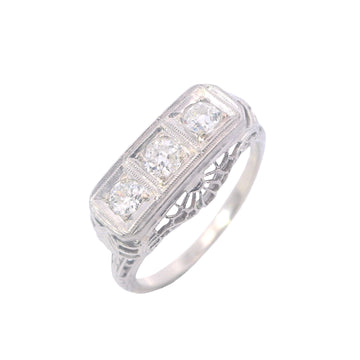 This estate piece is ready for its next home! This gorgeous vintage ring features three antique cut diamonds, situated on an intricately designed bar and totalling 0.59 carats. This ring is a size 7.5. Refurbished and ready for wear, this ring will be sold as is.