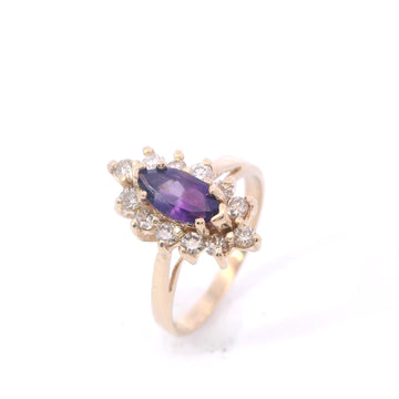 Estate 14 Karat Yellow Gold Amethyst and Diamond Halo Ring with a 7x4 mm Marquise Amethyst and approx. 0.35 Total Carat Weight of Diamonds Size 6. This piece will be sold as is.