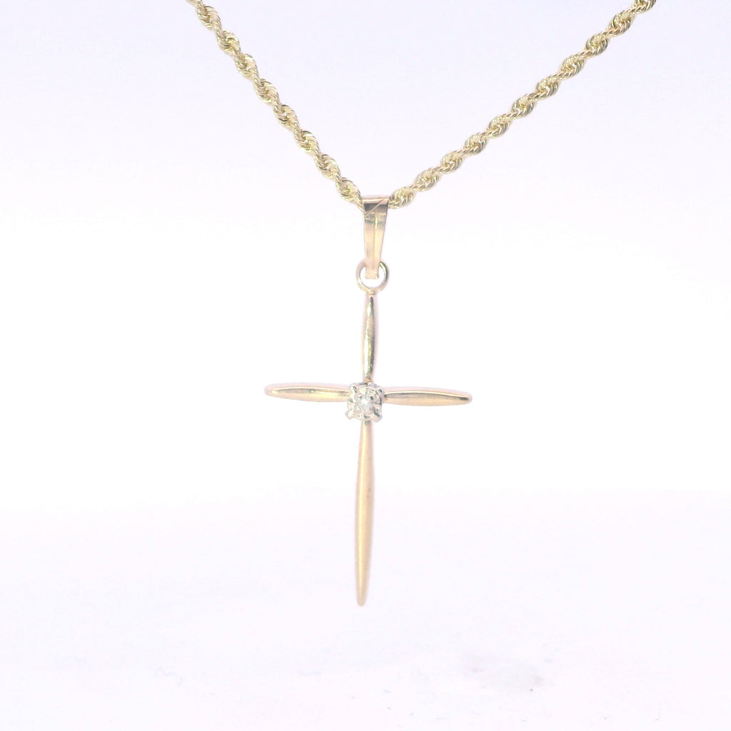 Estate Yellow Gold Diamond Accent Cross Pendant Rope Chain Necklace