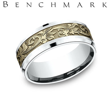 Benchmark 14 Karat White and Yellow Gold 8 mm Bevel Edge and Vintage Script Wedding Band Size 10
