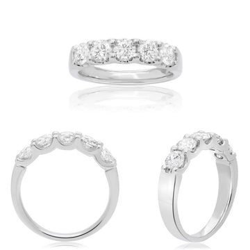 This stunning five-stone diamond wedding band is crafted in 14 karat white gold, offering a timeless and elegant design. Featuring five brilliant diamonds with a total carat weight of 1.00 carat, this ring radiates sophistication and sparkle. Perfect as a wedding band or anniversary ring, its classic style symbolizes everlasting love and commitment.