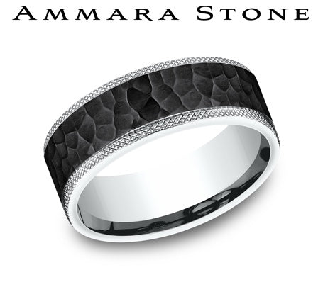 Ammara Stone White Gold and Black Titanium Hammered Center Knurled Edge Wedding Band