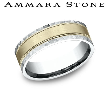 Ammara Stone White and Yellow Gold Satin Migrain Center Hammered Edge Wedding Band