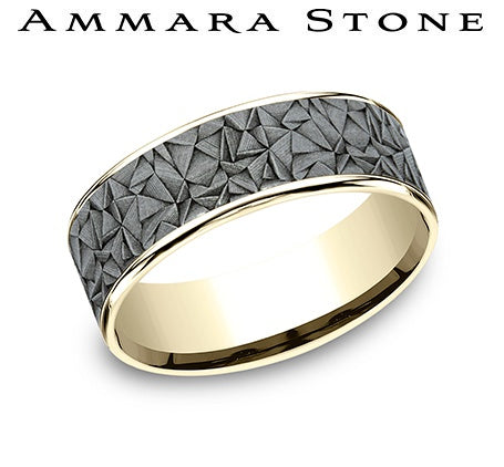 Ammara Stone Yellow Gold and Gray Tantalum Bevel Edge Fractured Rock Wedding Band