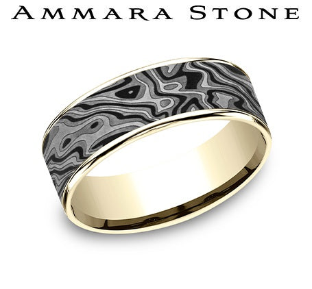 Ammara Stone Yellow Gold and Gray Tantalum Mokume Center Wedding Band