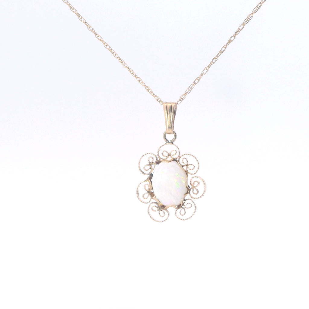 Estate Yellow Gold Filigree Opal Pendant Necklace