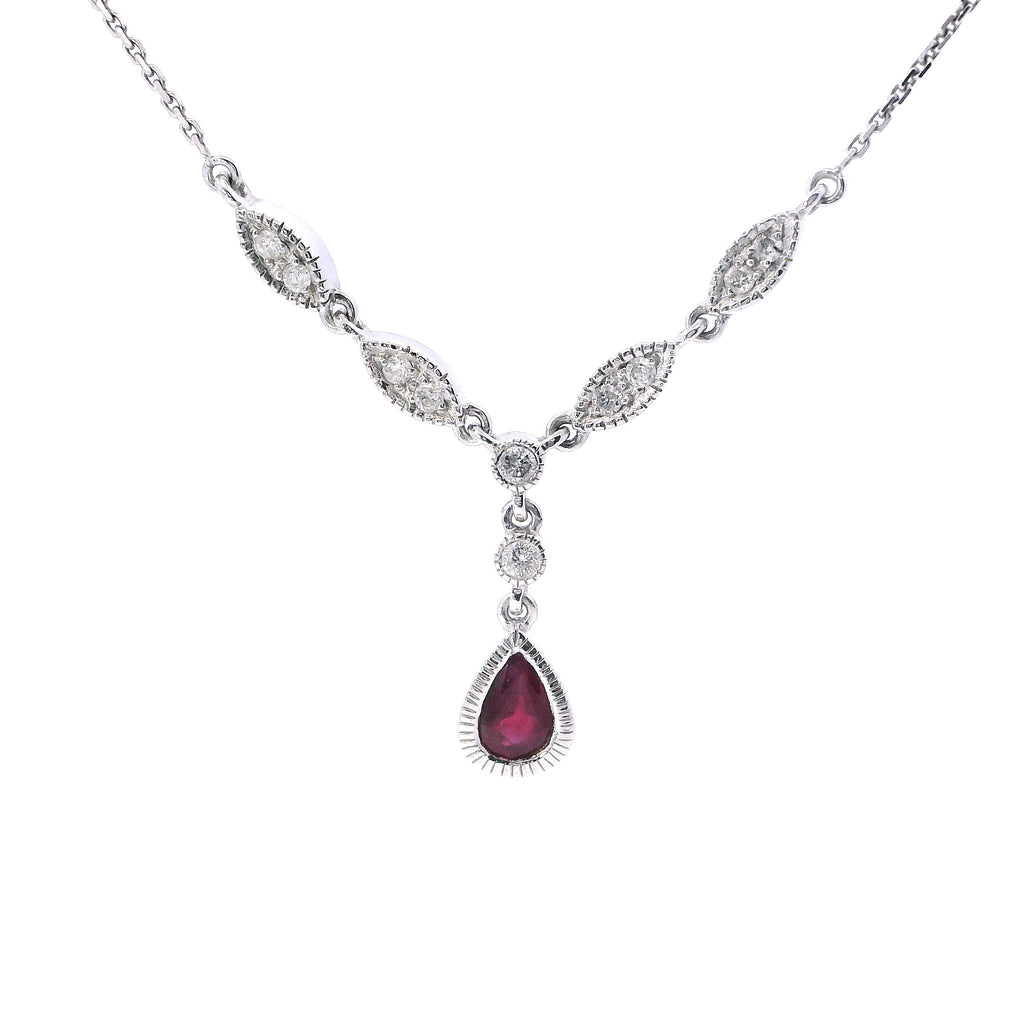 Estate White Gold Diamond Milgrain and Pear Ruby Pendant Necklace