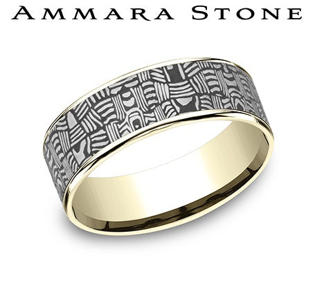 Ammara Stone Yellow Gold and Dark Tantalum Comfort Fit Tamascus Basket Weave Dark Center Thin Polished Edge Wedding Band