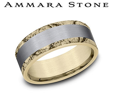 Ammara Stone Yellow Gold and Grey Tantalum Comfort Fit Satin Grey Center Marble Edge Wedding Band