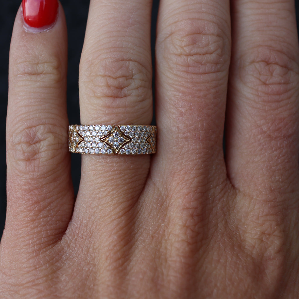 Reach for the stars with this stunning 14 karat yellow gold fashion ring! Sparkling pave diamonds totaling 0.90 carats dance across delicate star stations, creating a celestial design that catches light from every angle. The substantial, thick band provides the perfect foundation for this whimsical piece, offering both durability and presence on your finger. Perfect for adding a touch of cosmic charm to your everyday style or making a memorable statement at special occasions.